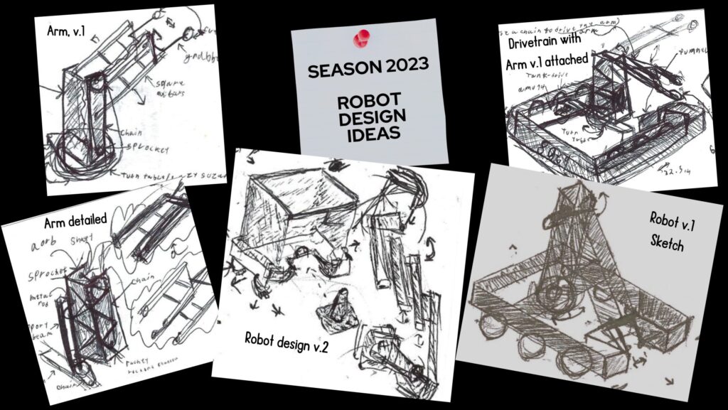 A week before the kick-off, our team sat down to brainstorm ideas for the robot design. In the image above, you can see different ideas I had during the first few weeks of the season.