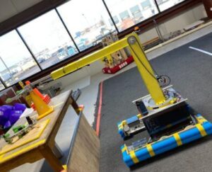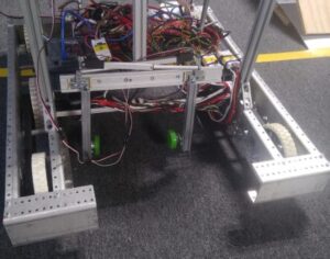 After we had a basic idea of the mechanisms we would have on our robot, it was time to add a grabber to the end of our arm, allowing us to pick up both cones and cubes off the playing field. I led a group of students in building a grabber. After some talks and simple prototypes, we ended up building a simple grabber made out of two linear servos, which pushed and pulled small arms mounted to a linear slide. This allowed the arms to move in parallel, giving us the maximum contact with our game elements. At the end of the small arms, we have ball bearings attached with rubber wheels glued to them. This allows picking up both cubes and cones off the ground. Because we have ball bearings at the ends, the grabber can pick up cones and keep them upright, whereas a standard grabber wouldn’t. Doing this makes it very easy to place the cones on the scoring poles.