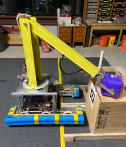 A few weeks in, we had a prototype drivetrain and an arm mounted on top of the drivetrain. The arm would pivot up and down to allow us to reach and place game elements (Cones) on top of poles to score points. Because we were still in the prototype stage, we used scrap metal to build the arm and clamped it to the drivetrain, allowing us to adjust its mounting until we found the ideal spot.