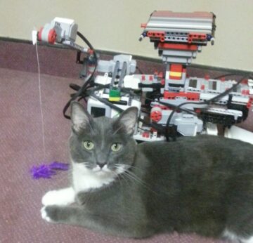 Technobot uses 2 EV3 Lego Mindstorms bricks, three large motors, and 2 IR sensors. It detects the cat, dispenses food, and follows the animal. Our cat likes his new best friend.